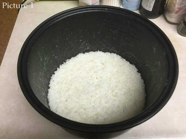 Colocar 2 tazas de arroz en una olla y añadir algo de agua en la olla. (Nota: 1 taza de cocina de arroz es de 180 ml, no igual a 1 taza de Estados Unidos.) Entonces usted debe lavar el arroz varias veces hasta que el agua de arroz no está nublado. Después, llene la olla con agua limpia y asegúrese de que la relación entre el volumen de arroz y agua es 4:5. A continuación, se debe cocinar el arroz en la arrocera; puede tardar unos 30 minutos (ver figura 1).