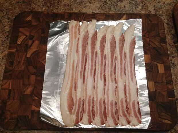 ¿No tapete de sushi? No hay problema. No necesita salir y comprar uno, papel de aluminio es una alternativa super fácil que funciona muy bien. Lugar de trozos de tocino en su hoja, al lado de uno vertical, que se solapan sólo ligeramente. (Recuerde, usted va ser balanceo lejos de usted, no lado a lado).