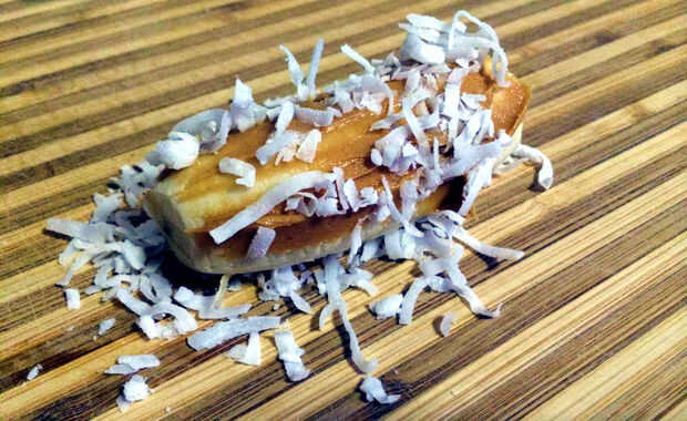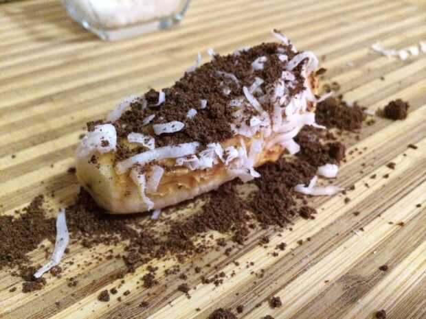 Coloque cada topping y rodillo del plátano + PB para cubrir en cada uno. Si quieres más aderezos para pegar, probar a partir de una capa más gruesa de mantequilla de maní antes de añadir nada.