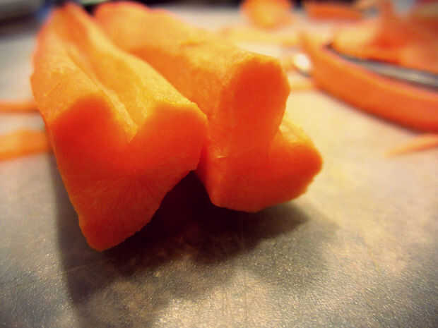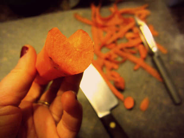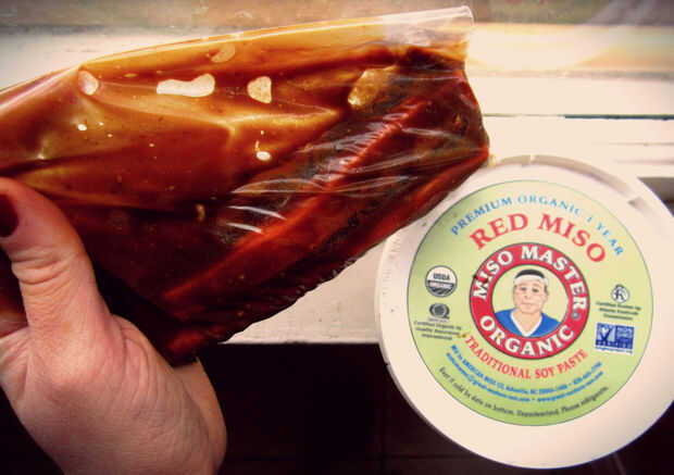 Cuchara 1 cda de pasta de miso de buena calidad dentro de una bolsa de sándwich de plástico. Añadir 1 cda de vinagre de arroz y 1 cucharadita de jengibre en polvo a la pasta de miso. Sello y "ensuciarse" hasta que se mezcle bien. Añadir las zanahorias al vapor a la mezcla, sellar herméticamente y mush la marinada alrededor de modo que cubra las zanahorias uniformemente. Lugar en el refrigerador, nos pondremos a los cuando se hace el arroz.