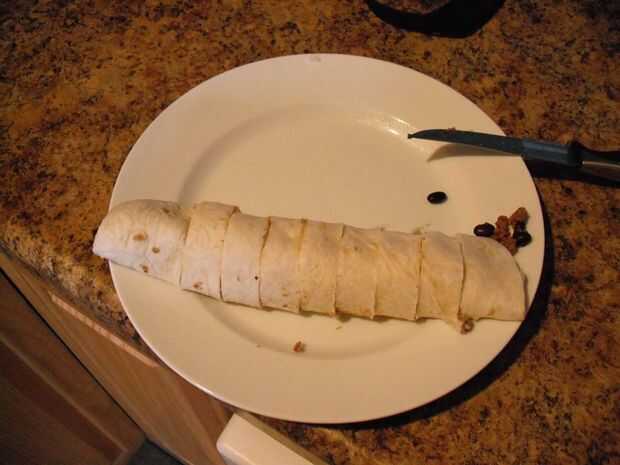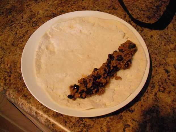 Una vez hecho el arroz, extender una capa de él sobre una tortilla. Esto actúa como pegamento, al igual que en el sushi regular. Luego agregar una línea de carne de taco a un lado de la tortilla. No ponga demasiado en o será difícil de hacer rodar! Enrollar la tortilla y usando un cuchillo afilado, cortar en rodajas.