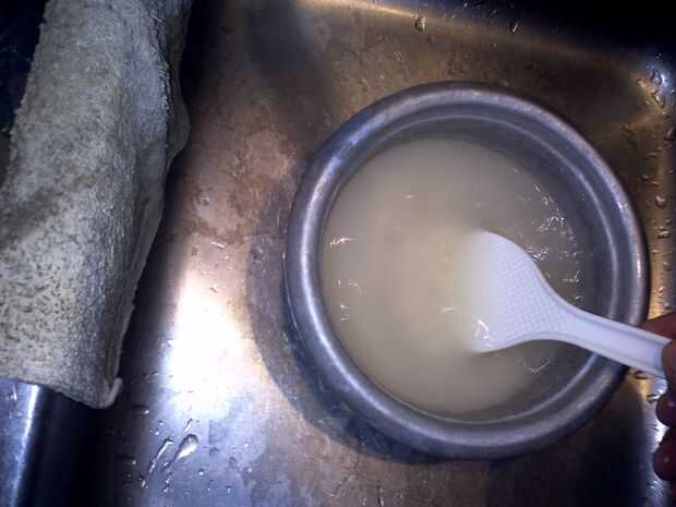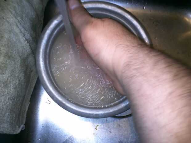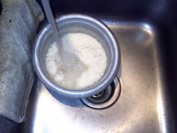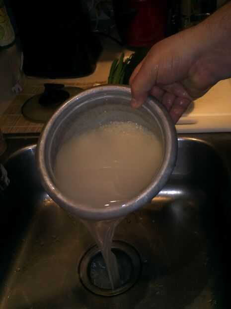 Medir el arroz y cocinar en su olla. Añadir agua fría para cubrir totalmente el arroz. alrededor de remolino con la herramienta mano o arroz. Vierta el agua teniendo cuidado de no perder el arroz. Repita este proceso hasta que el agua salga de la nave.
