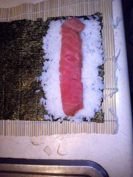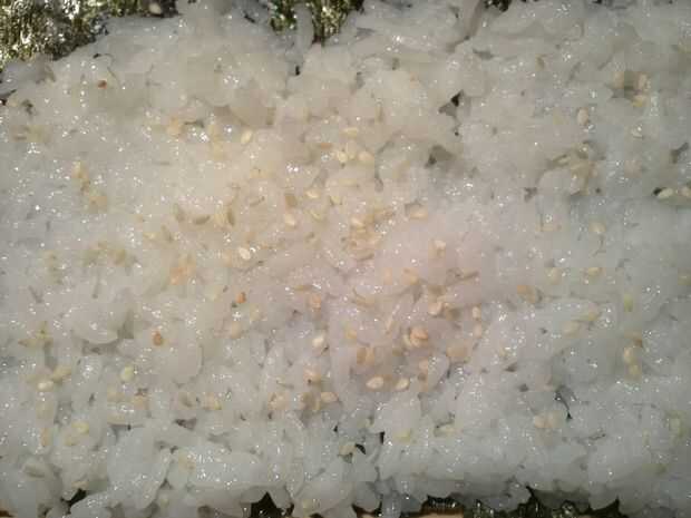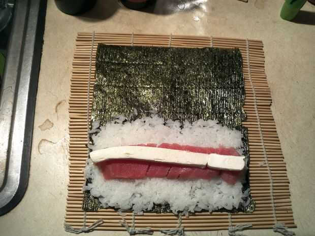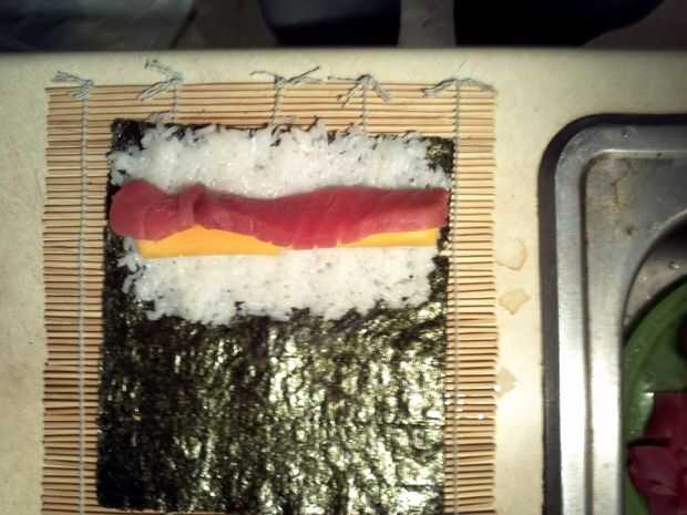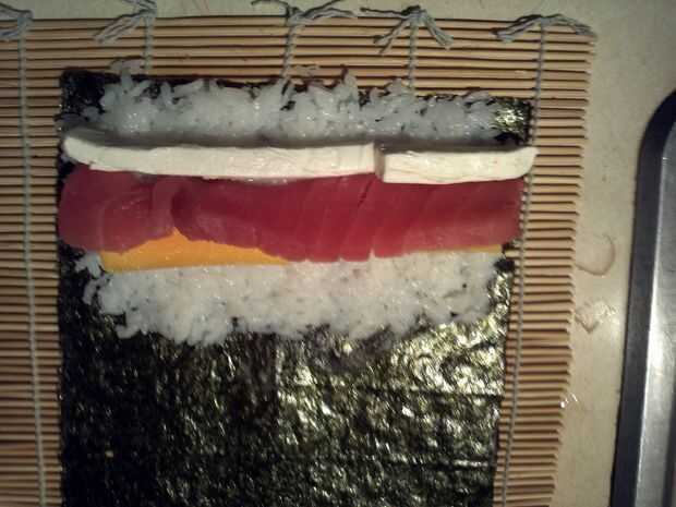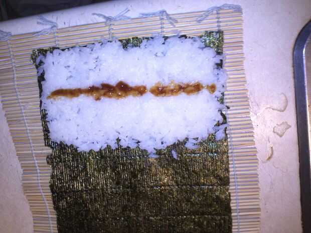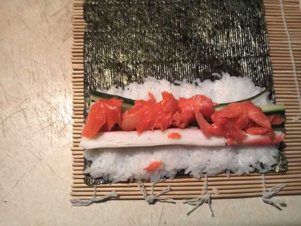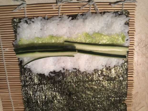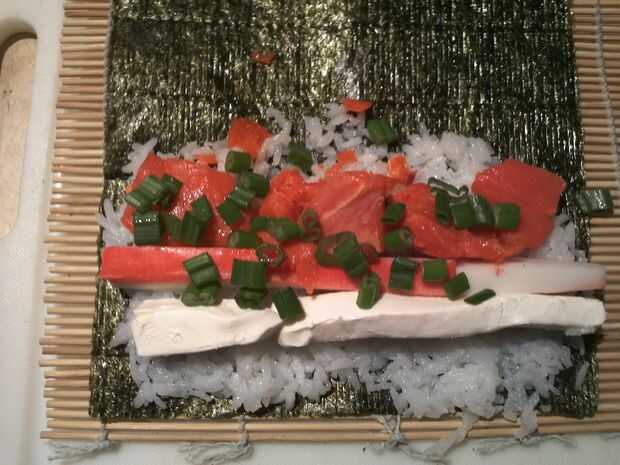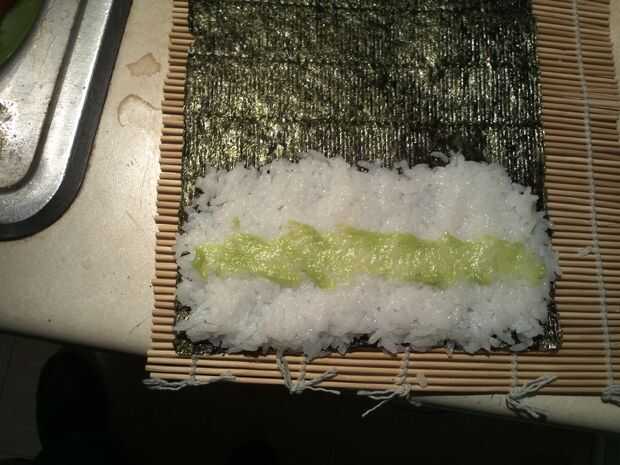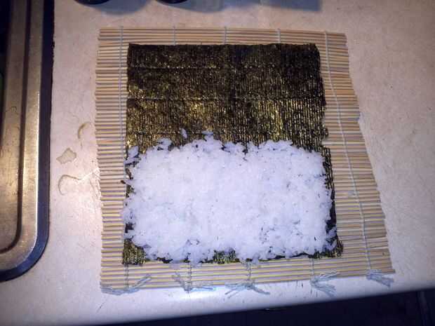 Sumergir las manos en el agua con hielo y agite el exceso. Tomar poco de arroz. Del tamaño de un huevo enorme. Posiblemente un poco más. Extenderlo uniformemente a lo largo de la parte inferior de la mitad de la hoja de nori. Se trata de la base. Debe ser solo 1 o 2 granos de arroz gruesos. Capa muy delgada. A continuación añade los ingredientes. Esto se puede hacer como mejor parezca. No hay ninguna receta set para rollos de sushi.