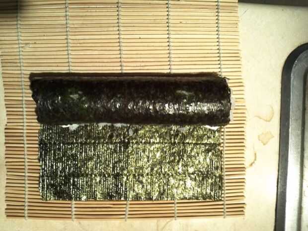Los bits dentro de TI tendrá que voltear el borde delantero de los ingredientes (cosas) y entonces es el momento de apretar con los dedos. Después de haber rodado tus cosas necesita utilizar la estera. Usted notará un poco de nori extra en el borde superior de su rollo. Moje un dedo en agua con hielo y "pintar" el borde del nori con el agua. Esto le permitirá adherirse al rollo. Continuar hasta que ha rodado sobre el borde del nori el roll. Ahora necesita para asegurarse de que está sellado.