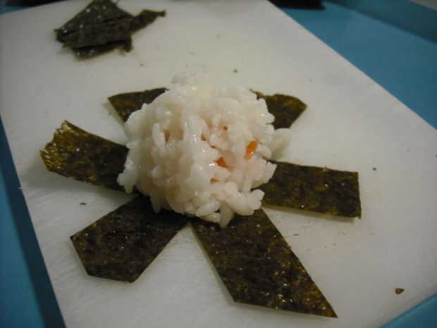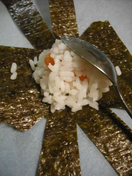 3 - colocar el relleno: círculo de arroz, relleno en el centro, el arroz en la parte superior.