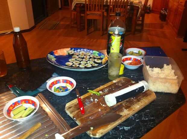 Ahora tienes un rollo de Sushi perfecto. Este rollo y refrigere durante 10 a 15 minutos ablandar la lámina de Nori. Retirar del refrigerador y cortar en trozos pequeños con un cuchillo limpio mojado. Le sugiero que trapo y moja el cuchillo después de cada corte para que el arroz no se peguen al cuchillo.