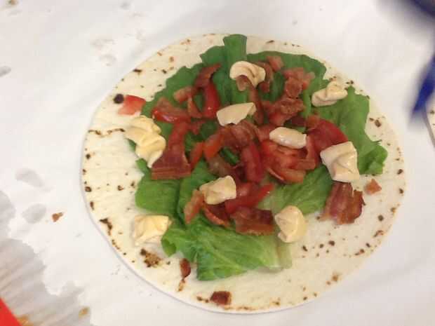 Romper para arriba el tocino cocido en trozos y espolvorearlos sobre la tortilla y la lechuga. A continuación, espolvorear sobre el cortar encima de tomates. Si desea añadir la mayo, añadir encima los pedacitos de tomate.