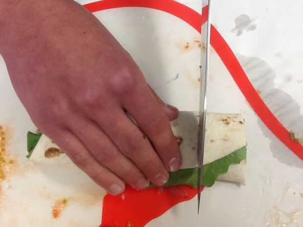 Enrollar la tortilla y cortarlo 2 pulgadas. Luego disfrutar!