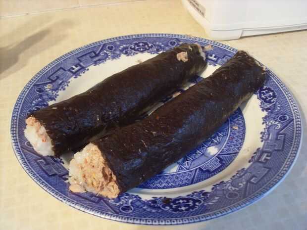 Esta es la parte más delicada del proceso, rodar todos juntos. Usted quiere el relleno en el medio tanto como puedas, en lugar de a un lado. Cuanto más practiques esto, mejor que usted conseguirá. Usted puede conseguir el sushi de bambú, esteras, que son una gran ayuda del balanceo. Una vez enrollada, moje los dedos con el plato de agua y moja todo el camino hacia abajo de la costura donde han rodado. Esto pegará el alga al instante. Entonces rodando el sushi alrededor, moja la piel entera con el agua del tazón de fuente, frotando con los dedos en. Pronto notarás la piel de alga marina en el estado más flexible.