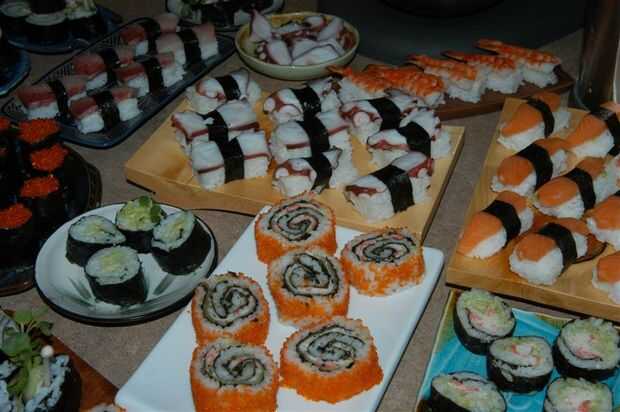 He hecho una fiesta de todo sushi vegetariano con queso de soja, frutas y verduras, huevos y quesos. ¿Por supuesto soy todo sobre el pescado, pero tienes que darles lo que quieren, derecho? Juego y experimento, usted no puede realmente estropear esto.