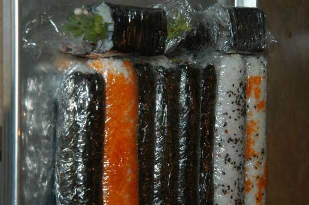 Rollos de envoltura puede fresco en celofán para almacenar (no más de unas horas o el arroz comienza a endurecer).