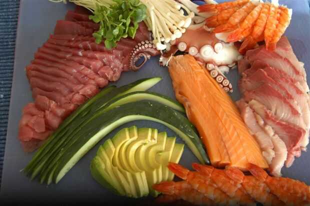 Recoger y cortar todos los ingredientes frescos y coloridos. Aquí tengo atún, salmón, pulpo, pez, gambas, aguacate, pepino, hongos tallo pequeño y verde de rábano.