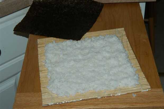 Para rollos de "inside-out" empezar extendiendo el arroz uniformemente en la estera de bambú envueltas.