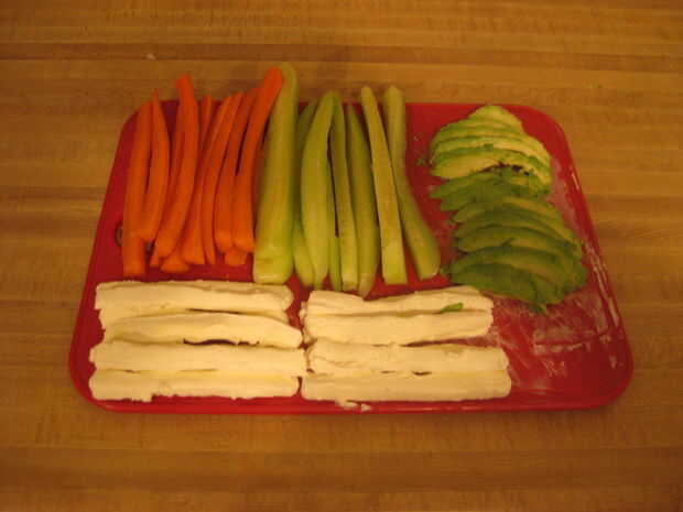 - Retire queso crema empaquetado y rebanada en tiras largas y estrechas como se muestra.