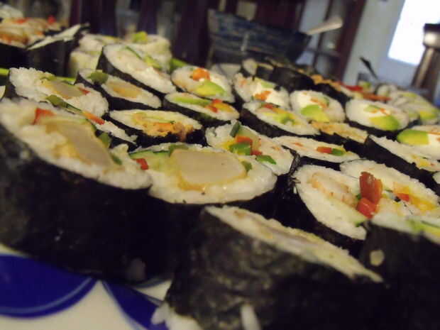 Trato de hacer sushi para mi familia y amigos de vez en cuando, tratando de permanecer fiel a la japonesas recetas y costumbres. Desafortunadamente, todavía tengo que hacer con los ingredientes disponibles y atender a los gustos de todos, tanto a mi consternación, encontrarás alguna licencia poética en los rodillos implicados.