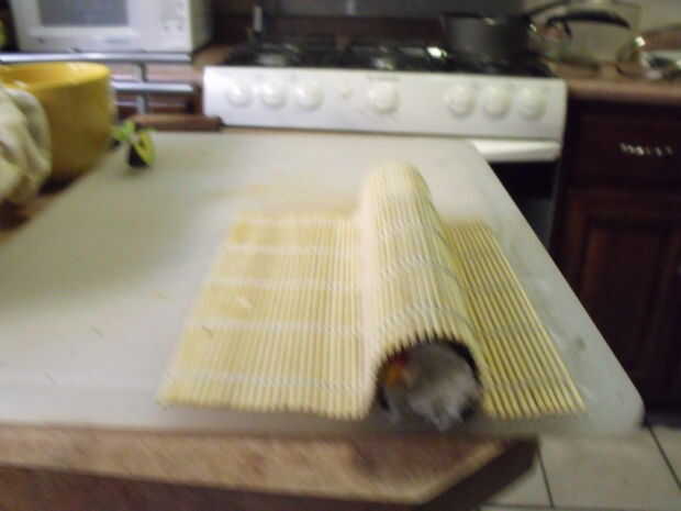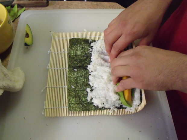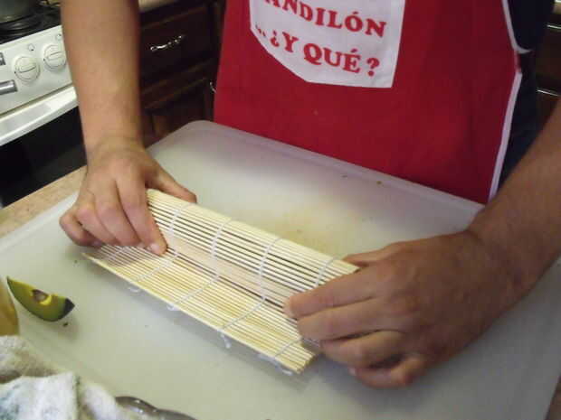 Asir un asimiento del borde más cercano del makisu con los pulgares, luego colocar el resto de los dedos justo después de los rellenos, ahora Levante y Enrolle firmemente, aplicando presión suave y uniforme. Cuando el borde del arroz afecta el resto del arroz, sacar el makisu y reorganizar así que usted puede rodar todavía.