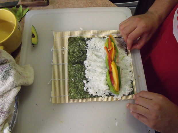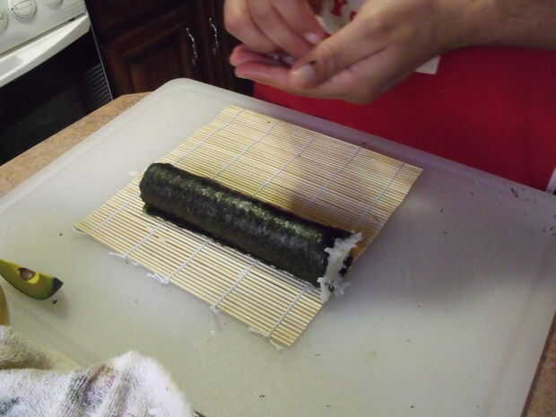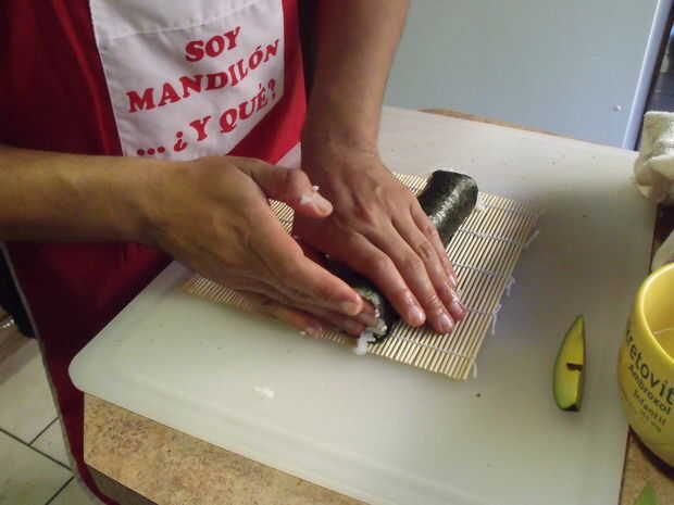 Si tus rolls son un poco irregulares alrededor de los bordes, una cucharada de arroz y una bolita para cubrir los extremos. Finalmente, aplique presión en el rodillo para hacer como cilíndrico posible.
