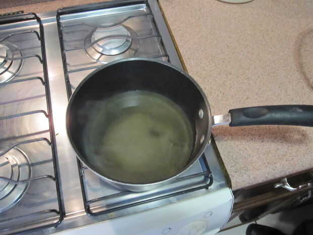 Calienta la mezcla suavemente sobre una llama baja hasta que el azúcar se disuelva y luego deje que se enfríe completamente. No mire directamente a la olla, idiota, que te quema los ojos!