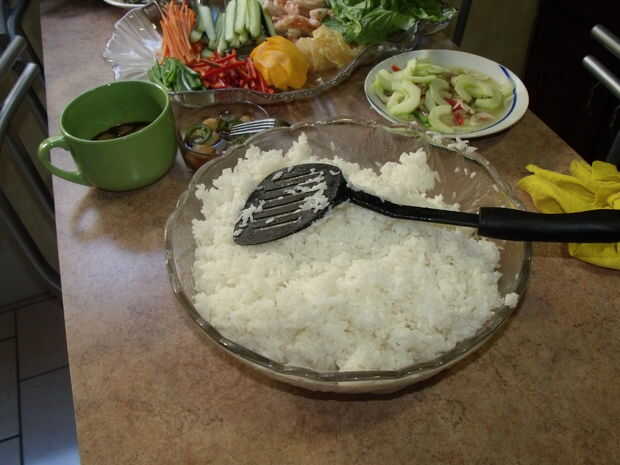Luego, volcar el arroz a la vez en un gran recipiente no reactivo. Uso de metal y te mancha con el vinagre y hacer el arroz amargo... Los japoneses tienen una gran ronda tina de bambú llamado hangiri , pero hará ensaladera Querida mamá.