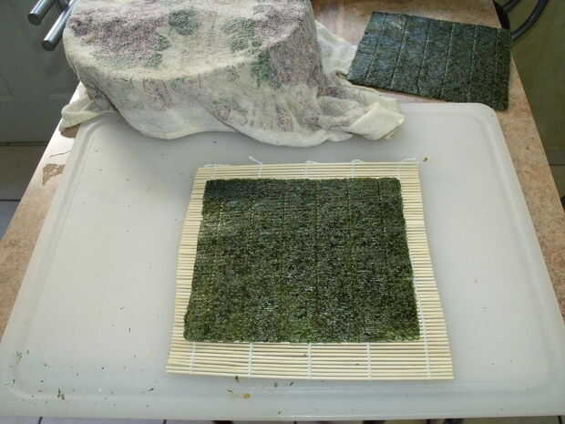 Coloque la hoja sobre el tapete de sushi (makisu), lado brillante hacia abajo, borde largo hacia usted. Un makisu buena se hace de bambú, tiene 4 a 5 hilos de cadena y es tejido, con nudos en solamente un lado. Mantenga los nudos mirando hacia fuera.