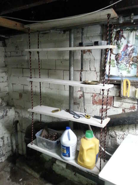 Mi hermana tiene el sótano más tonto: expuesto a lo largo de la mayor parte de las paredes de tubos. Si no hay tubos, paredes de bloques impidieron colgar elementos organizacionales por lo que diseñé una plataforma suspendida que podría ser embalada para arriba y enviada a la siguiente casa.