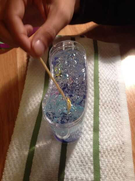 Comenzar a agregar elementos a tu gel. La forma más fácil es utilizar algunas pinzas largo o unas pinzas de cocina, aunque éstos podrían introducir más burbujas. Utilicé un palillo de dientes, que puede dificultar la posición cosas exactamente cómo quieres pero funciona si tienes la paciencia para ello.