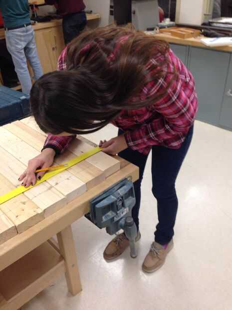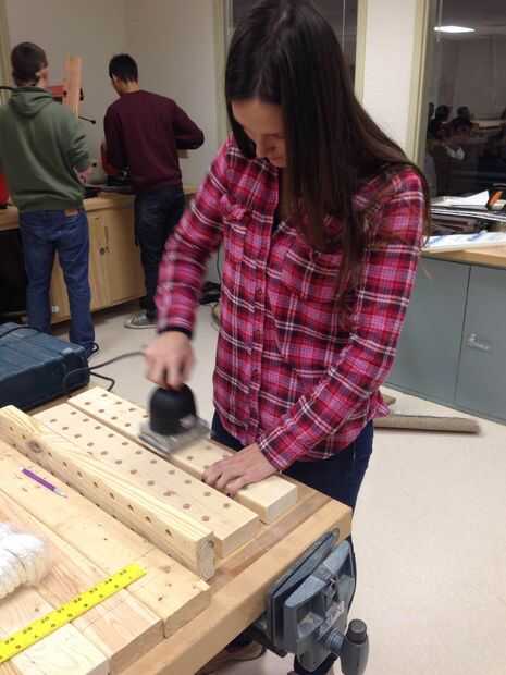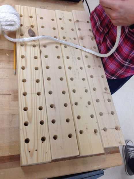 La silla está conectada juntos por cuerda. Para ello tenemos que taladrar agujeros en las 16 piezas de madera y luego tejer la cuerda por los agujeros. Primero tenemos que establecer las ubicaciones de todos los agujeros. Lo que decidimos hacer fue hacer 11 agujeros en un extremo de la madera y 11 agujeros en el otro extremo de la madera, para que todos juntos hay 22 agujeros, cada uno con un diámetro de 9/16", en cada pedazo de madera que se conectarán por cuerda. Después hicimos los agujeros hemos decidido pulir la madera otra vez porque la perforación de agujeros en la madera puede hacer bruto otra vez.