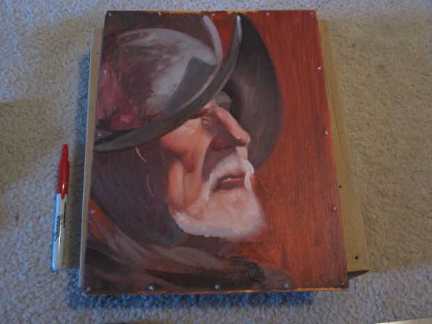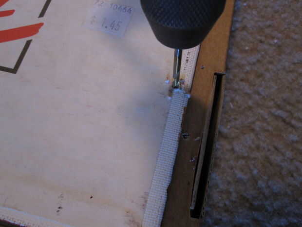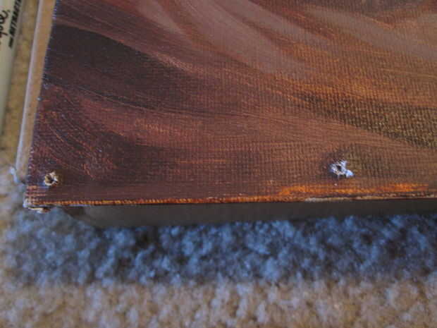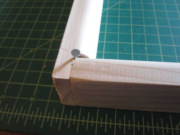 Nota: he decidido ir con 1 clavo en cada esquina. Ser retrospectiva 20/20, que esto no era una buena idea. Yo debo han ido con 2 clavos en cada esquina, no sólo por estética, sino también porque hace más fácil hundir el clavo en la madera sin golpear los tornillos que sujetan las esquinas.
