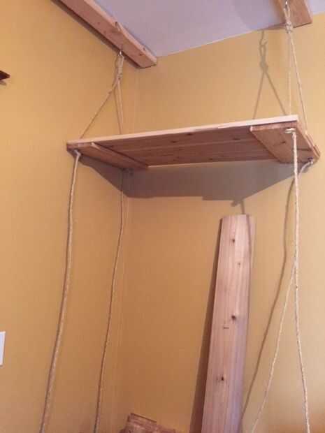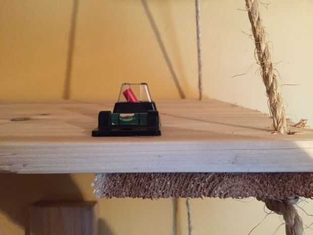 • Comenzar a ensartar la cuerda a través de las esquinas de la plataforma 1. Asegúrese de que la ayuda solicitada tira la cuerda en direcciones aleatorias. Una vez que la plataforma esté en su lugar, nivel de la plataforma y poner nudos debajo del estante para sostenerla en lugar.