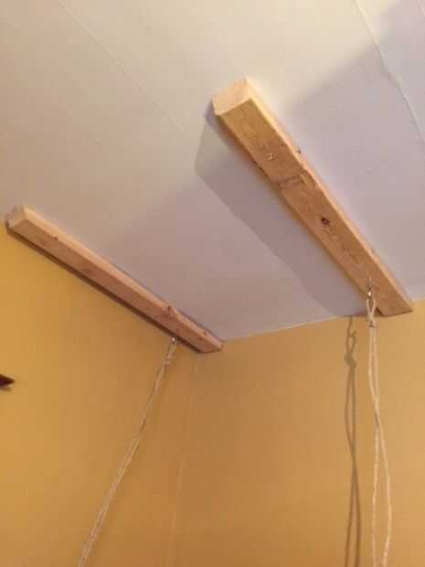 • Utilice un localizador de montantes para ubicar los tornillos de pared seca en el techo, lo que indica un haz de luz. (Mi buscador del perno prisionero iba haywire cada vez que toca.)