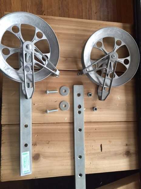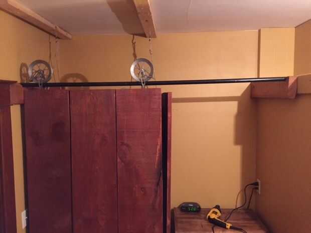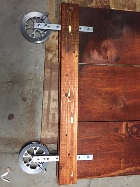 • Comprar un par de ropa ruedas de línea (Asegúrese de que la tubería de hierro negro puede caber entre la rueda y rueda de soporte/apoyo. También es necesario un par de barras planas (soporte lateral) y tornillos. Montar (véase el cuadro) en la parte posterior de la puerta del granero del armario.