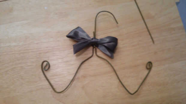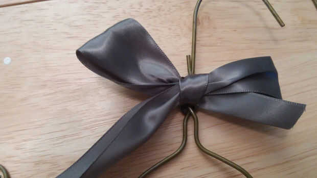 Para agregar alguna decoración adicional y para ocultar el pegamento caliente decidí añadir un arco de la cinta a la parte superior de la percha. Esto es totalmente opcional, pero darán un lindo toque.