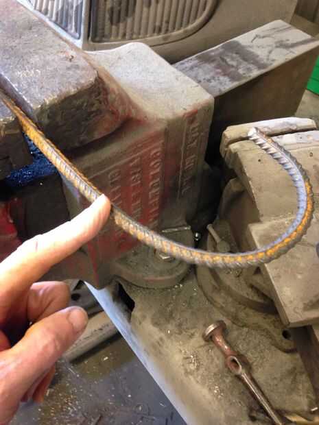 Había doblado un gancho "J" en el otro extremo de la varilla. Esto me permitió utilizar el resto de la varilla como una palanca, por lo que pude doblar a mano. Mi dedo muestra sobre donde cortaré este gancho "J" de la varilla para la soldadura lo que pasará más adelante. Después de cortar este gancho lejos, otro gancho de la curva y corte, también. Entonces la curva un tercer gancho por lo que será punto del tanque cuando el primer gancho se cuelga en el tanque.