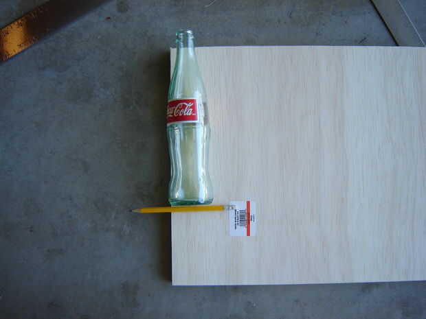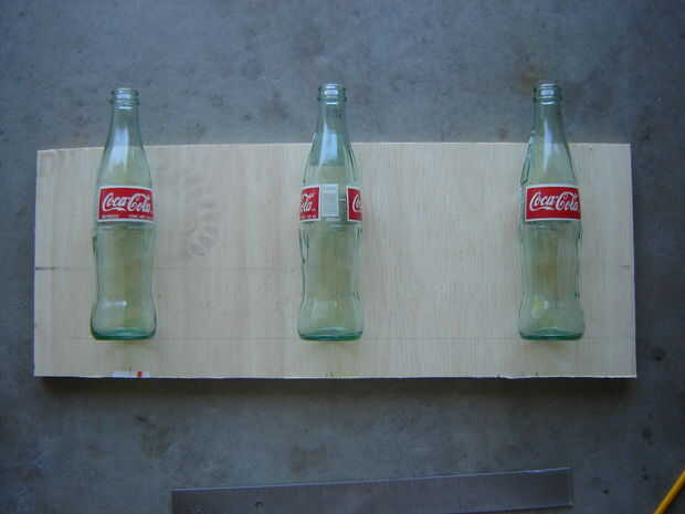 Medir a la madera contrachapada. Uniformemente espacio las botellas y trazar una línea por donde quieres el fondo de las botellas.