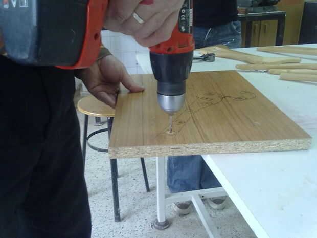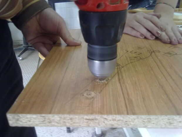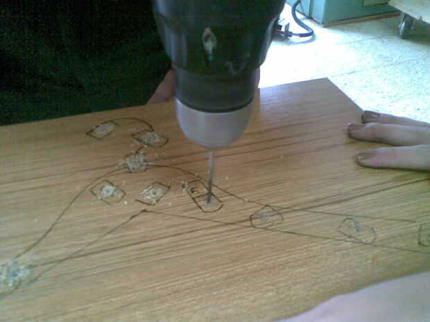 Después decidí donde fijar los soportes de suspensión que empecé a hacer agujeros en el soporte de lugares marcados. Luego perforé puntos marcados que montar los tornillos en él. Empecé a fijar con tornillos a mi suspensiones con taladro.