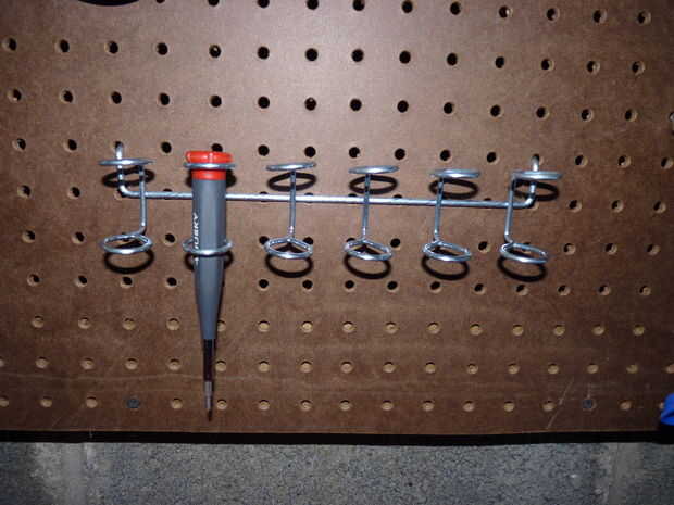 Más de la época, utilizo mis destornilladores de precisión más de regular tamaño unos, pero tenía no hay manera de colgarlos del pegboard sobre mi mesa de trabajo. Tuve que modificar el soporte estándar para reducir los agujeros así que mantendría herramientas más pequeñas.