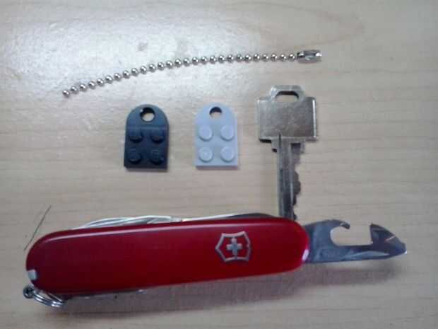esto es muy simple, todo lo que necesitas es: -una clave -una pequeña cadena de conexión -dos piezas de lego con los agujeros en ellos (o usted podría perforar su propio otros ladrillos -una navaja destornillador o suizo -una luz interruptor tapa