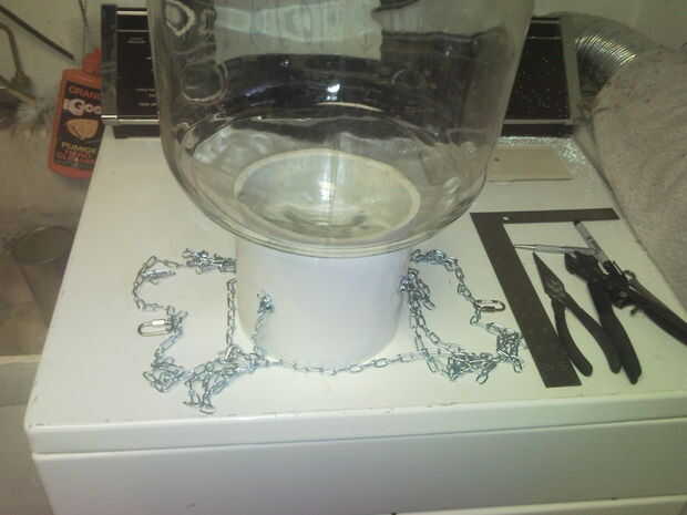 Una vez que los 4 (o 3) para el PVC, es el momento de colocar la Damajuana (abertura hacia abajo) en el acoplamiento de la tubería. A continuación, clip las copas todos juntos en la parte superior la Damajuana para las cadenas por su trabajo los próximos pasos. La cadena de circunferencia coloqué cerca de 2/3 por el lado de la Damajuana. Una vez más esto es solo globo del ojo. He intentado colocarlo suficientemente alta para la bombona no derramarse accidentalmente pero lo suficientemente bajo el ti no deslice underneith cualquiera de los dos. Los ganchos S de clip en las cadenas de la vertical donde vas a poner la circunferencia cadena (C-de ahora en adelante). Para la cadena de C, comenzar con el primer eslabón en el primer gancho de S pero no ' cerrar todavía. Envuelva la cadena de C dentro de las cadenas de la vertical todo el camino alrededor y volver a ese primer gancho en S y cerrarla para sostenerla. Luego cuente los vínculos y el espacio donde los otros ganchos S enlazar con la C-cadena.