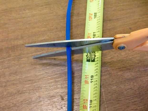 Cortar cuatro tiras de paracord con cada medición 10 pies (3,048 metros). Esto puede parecer mucho, pero recuerda que vas a doblar a todos estos hilos en la mitad. Va a utilizar algunos de su cuerda cuando usted haga sus nudos.