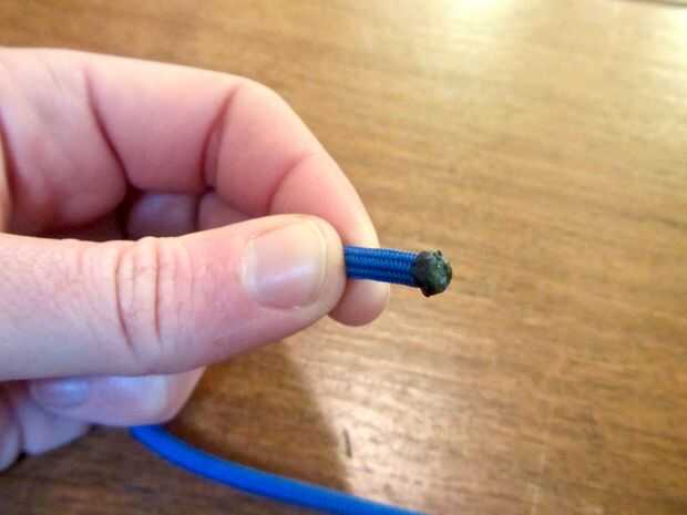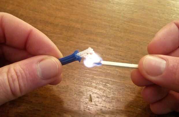 Con cuidado utilizando una cerilla o un mechero, quemar los extremos de su paracord para sellar los extremos se. Si decide omitir este paso, el paracord continuará a desentrañar. Si desea un final mejor, usted puede moldear el extremo de nylon fundido con el dedo pulgar y dedo índice pero tienes que ser extremadamente cuidadoso al final estará caliente y el nylon fundido puede pegarse a quemarle las manos. No me importa el extremo chamuscado, así que generalmente sólo mantenerlo que se funda, sólo asegurando que el extremo se ha derretido y se evitar que se deshilache.