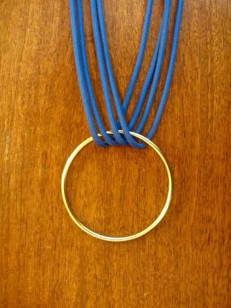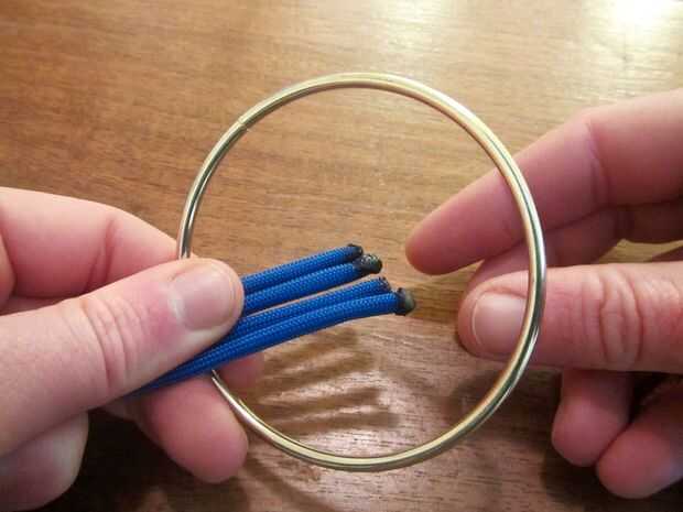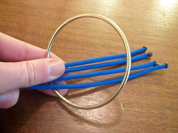 Sus cuatro filamentos a través de su anillo del hilo de rosca. Tire de ellas a través de hasta que haya una longitud hasta de paracord a ambos lados del anillo.