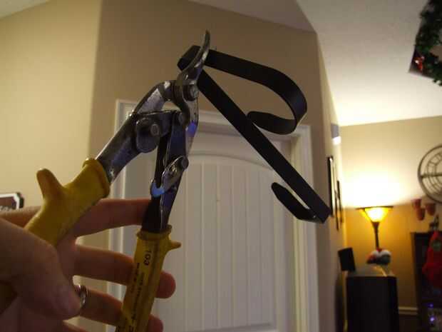 Alicate para doblar el gancho donde desea que la parte superior del árbol para colgar y usar tijeras de lata (o una amoladora o algo apropiado) para cortar el metal adicional.