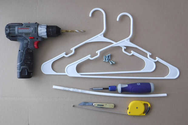 Se necesita 2 colgador de ropa barata en Walmart, un pie de tubería plástica y los 6 tornillos de cualquier centro de abastecimiento casa. Un destornillador, taladro de 1/4 pulgada y regla estan bueno tener, pero se puede llegar con sólo un cuchillo.
