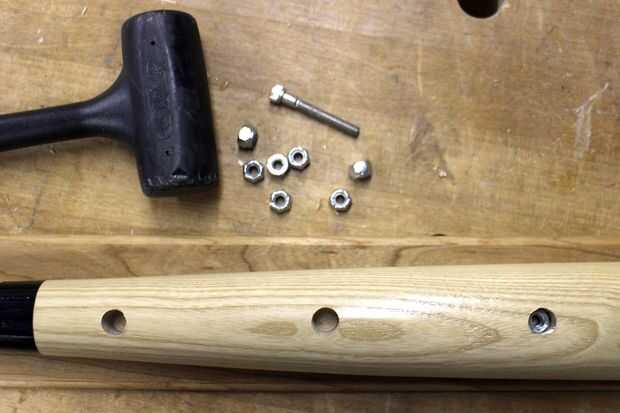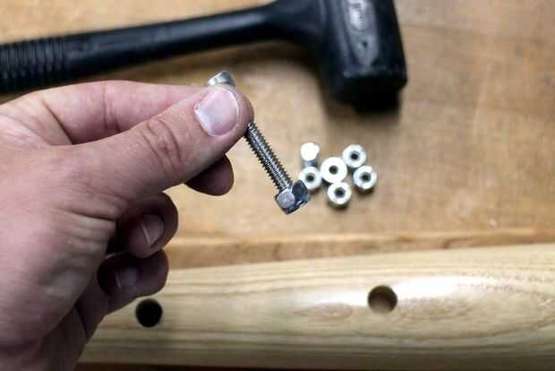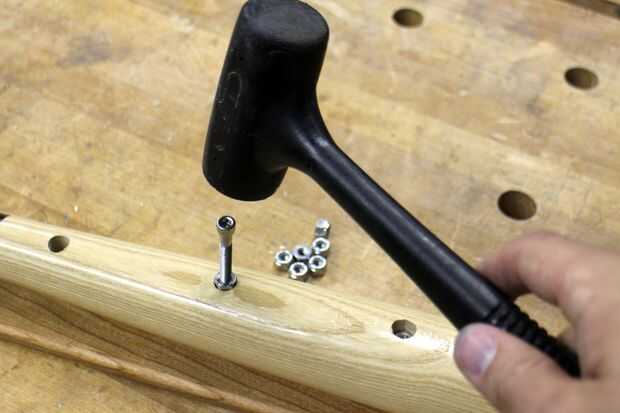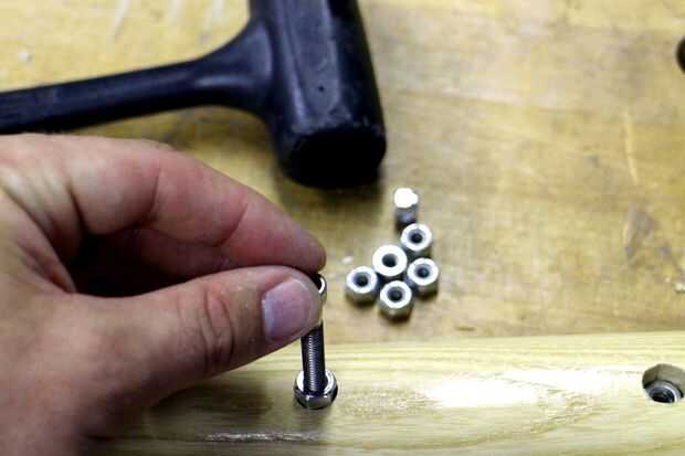 Las tuercas roscadas deban estar sentado en la parte inferior de cada abertura perforado. Puse una tuerca en la parte inferior de un perno roscado espacio tenía por ahí, entonces utiliza un martillo de golpe muerto para golpear ligeramente las tuercas en los orificios perforados. Cuando la tuerca estaba sentada totalmente el perno fue sin rosca de la tuerca y retirar, este proceso fue continuado para cada tuerca hasta que se instalaron.