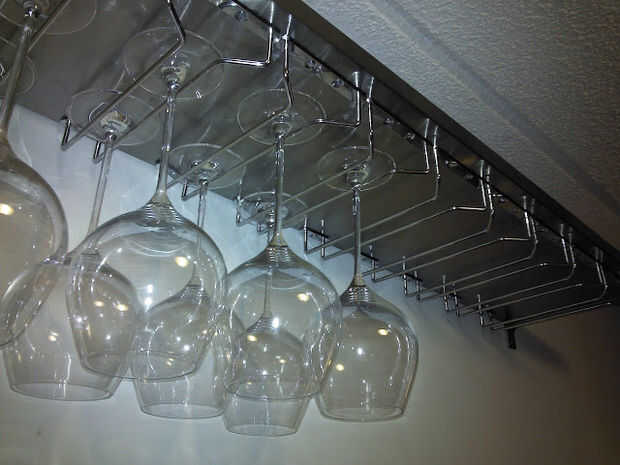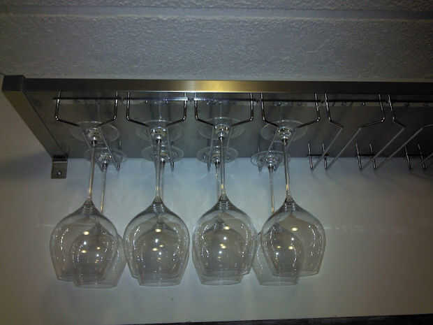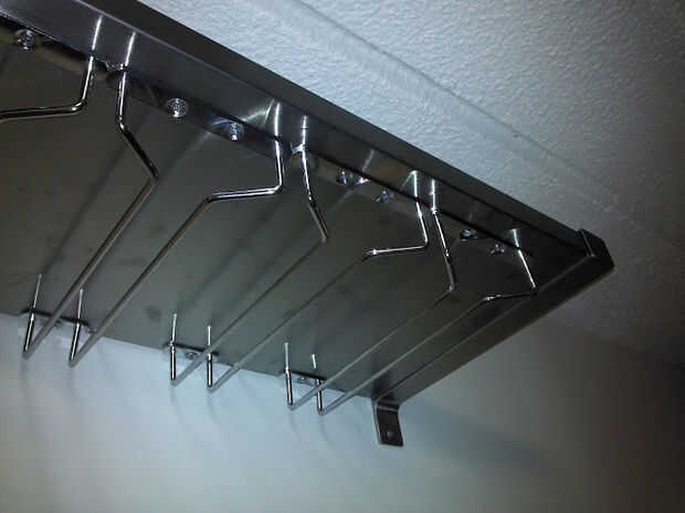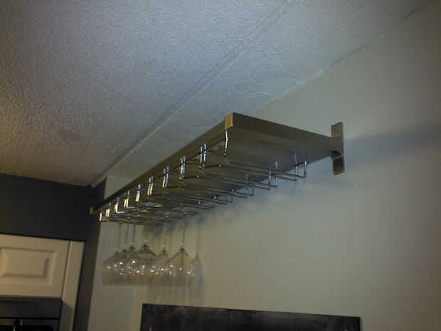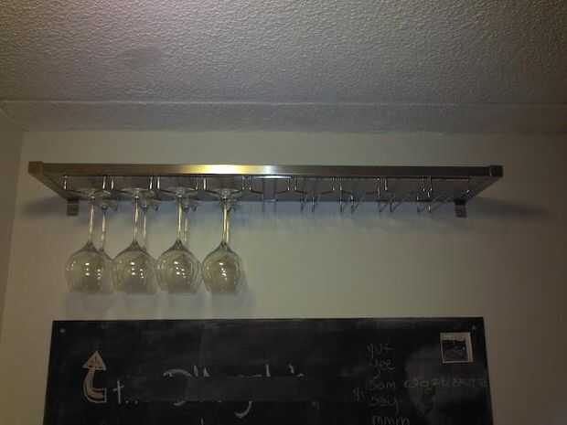 necesitaba un estante del vino, pero desde que vivo en un apartamento que tenía cabida para una barra de pie. Todos los hacks de barras independientes o en gabinetes y armarios de mi demasiado bajos para colgar copas de vino. Y todo en línea era demasiado pequeños o muy caro.