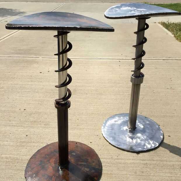 he encontrado algunas piezas frías en un cubo de metal de desecho, dos cúpulas piezas circulares de acero y dos curvas circular piezas de acero. Les agarré fuera el recipiente de desecho con taburetes en mente. 6 meses después de la reunión más chatarra, aquí están!