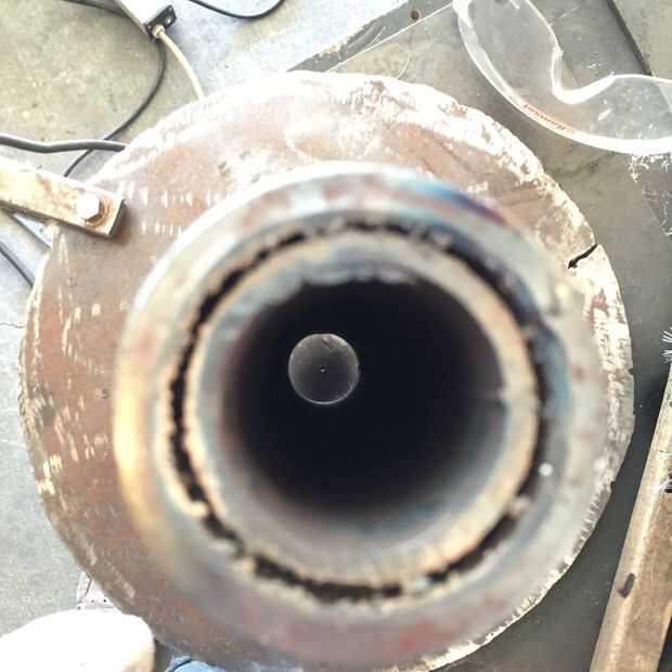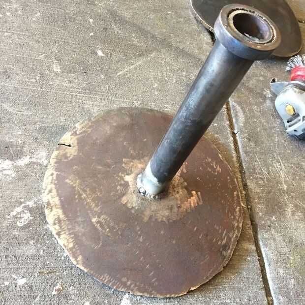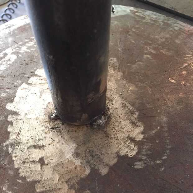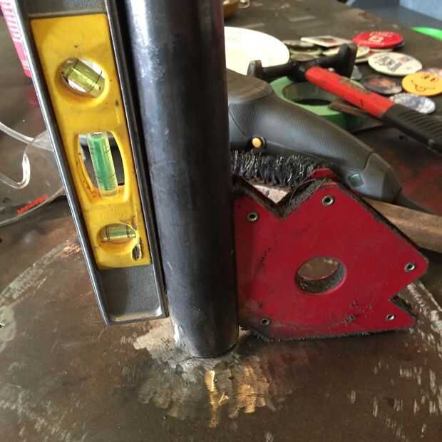 Tomando la última pieza te a soldado con autógena, bancos y centro en la base, utilizando un 90 grados imán y un nivel para mantenerlo recto, tachuela soldadura todo el camino alrededor