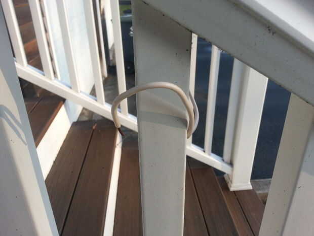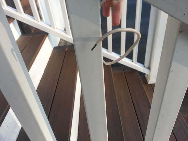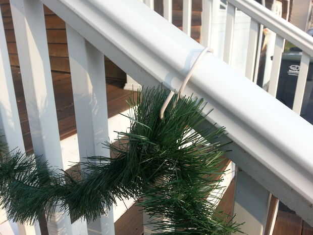 Para quitar los soportes de suspensión, retirar la decoración y luego incline el gancho hacia arriba hacia la barandilla. Esto inclinará el bucle parcial que rodea la espiga o el post. Gire el soporte inclinado al lado para liberar el bucle parcial de todo el post. La suspensión se puede levantar de la barandilla y almacenada hasta que se necesite otra vez.