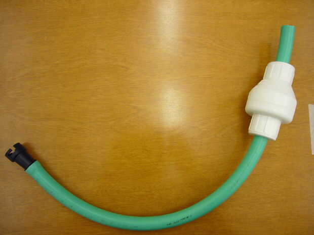 Usé una simple manguera de jardín para funcionamiento de la bomba a la válvula de retención, luego desde el otro lado de la válvula en el globo. Las guarniciones son acopladas y tamaño apropiado, y utilicé pegamento para asegurarlos y evitar cualquier fuga de aire...