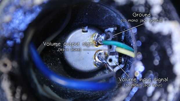 Después de abrir la placa, veremos que la perilla de volumen tiene tres piernas (ver imagen). Tendremos que extender las clavijas de entrada y tierra, que el pin de la izquierda y derecha, respectivamente, nuestra nueva jack mono.